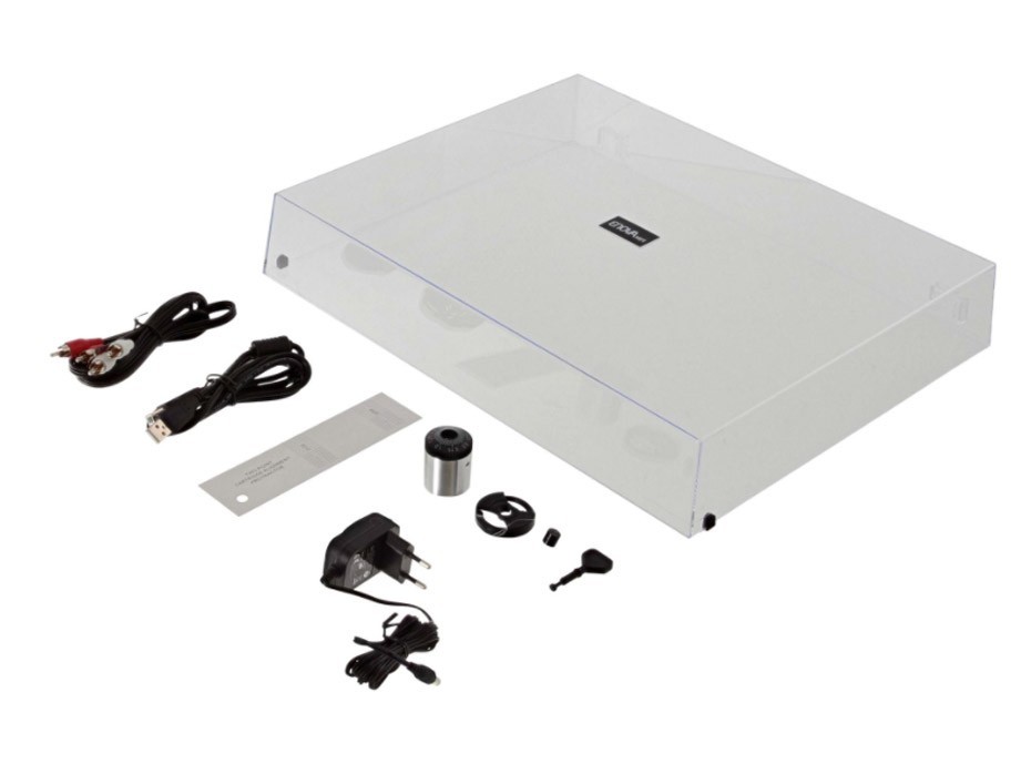 - Accessoires inclus : courroie, alimentation externe, centreur 45T, câble USB